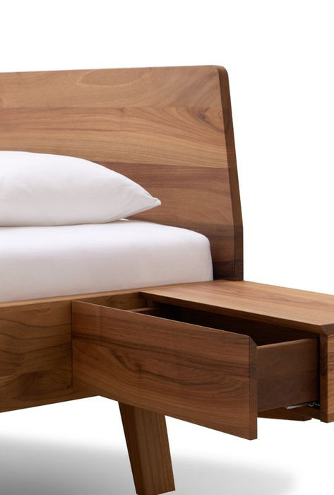 Elegant, leicht, harmonisch. Die Linie Elba mit sanften, abgerundeten Ecken fügt sich schwebend in den Raum ein. Ganz schön praktisch: die setilich angebrachten Nachtkästchen mit Schublade oder sichtgeschütztem Ablagefach.